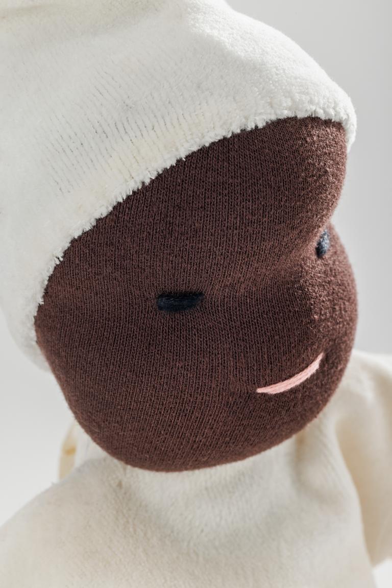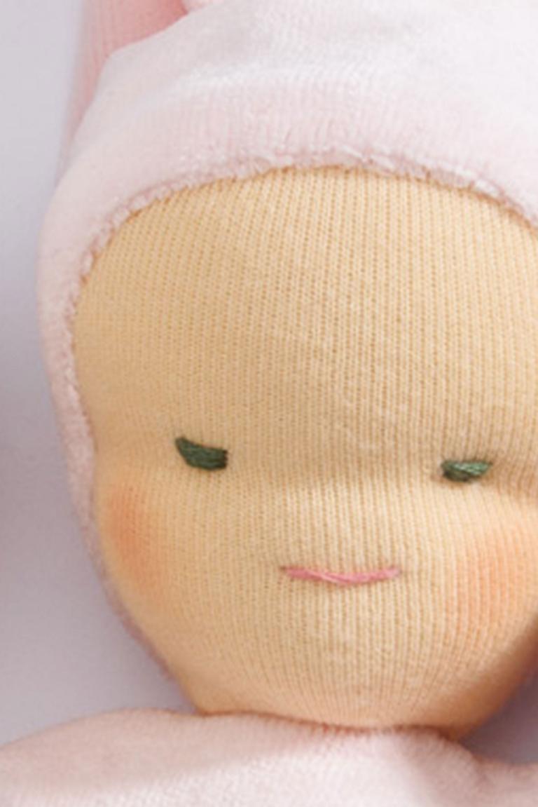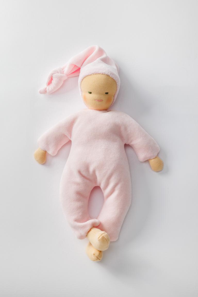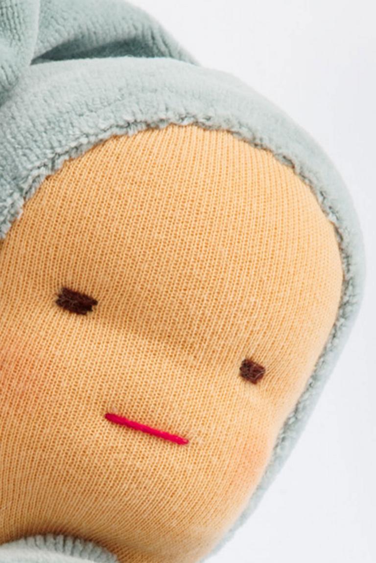 Diese Puppe aus weichem Stoff ist angenehm schmusig und ideal für Säuglinge und Kleinkinder. Ihre handliche Größe (ca. 30 cm) und einfache Form eignen sich gut für kleine Hände und erste Spielerfahrungen. Das weiche, bewegliche Design fördert die Feinmotorik, indem das Kind lernt, die Puppe zu halten und zu formen. So werden Tastgefühl, Koordination und Hand-Auge-Steuerung unterstützt. Gleichzeitig regt die Puppe die Fantasie an und lädt zum Kuscheln und Rollenspielen ein.